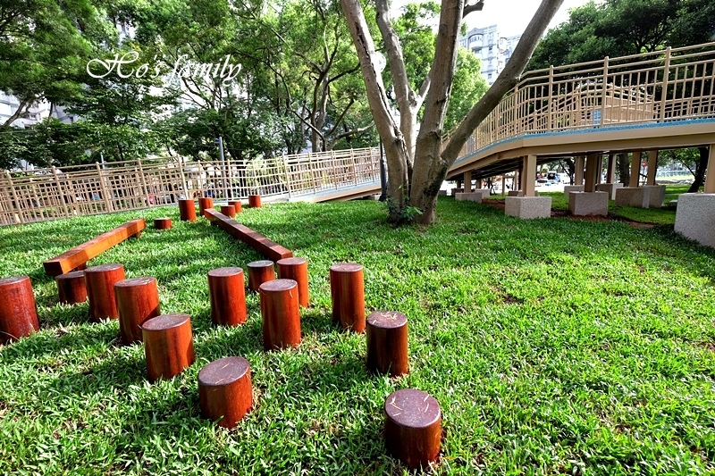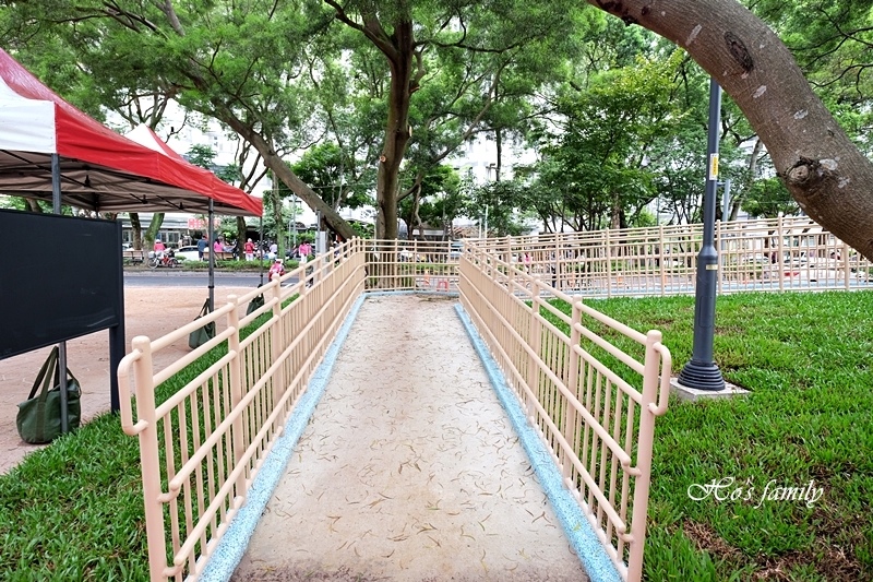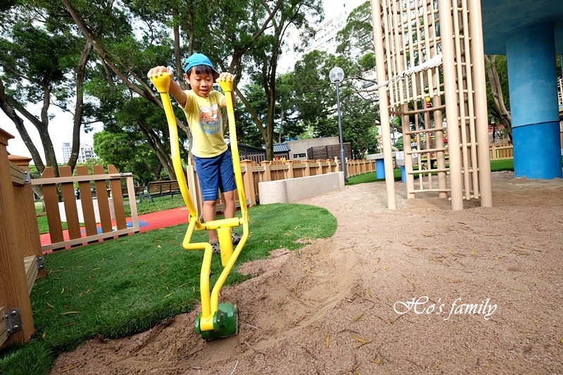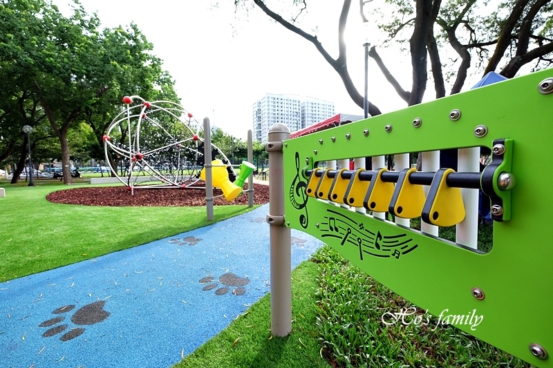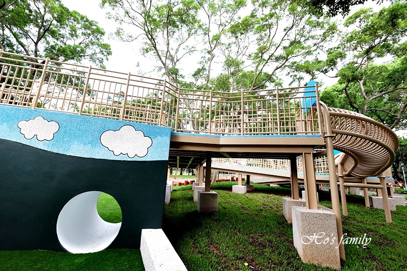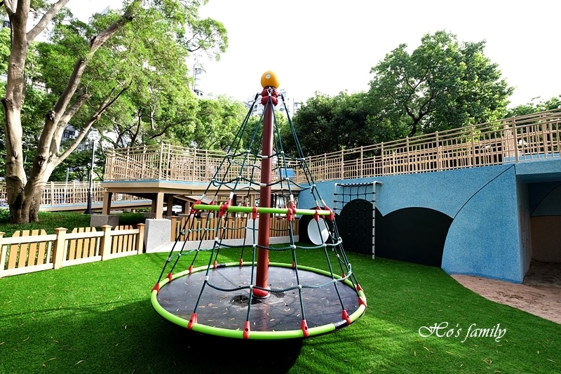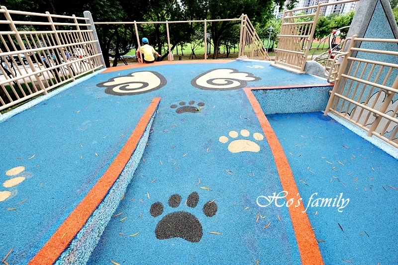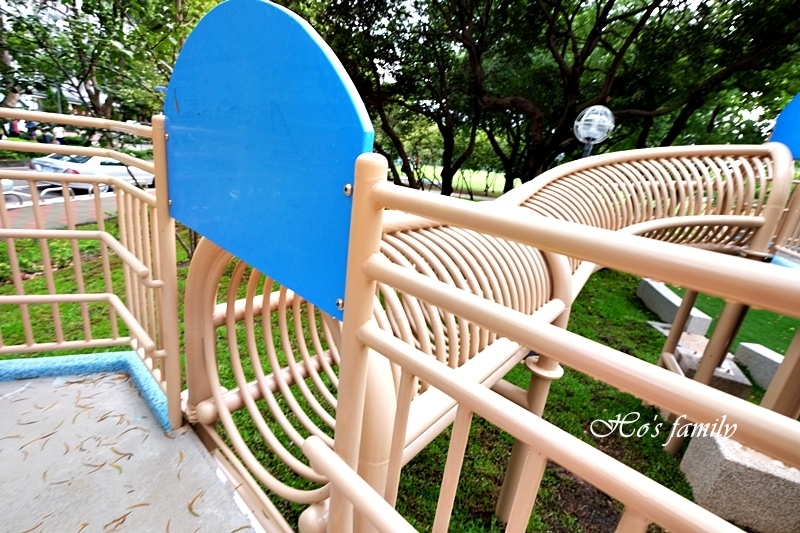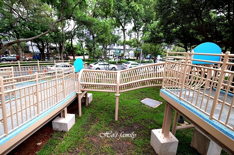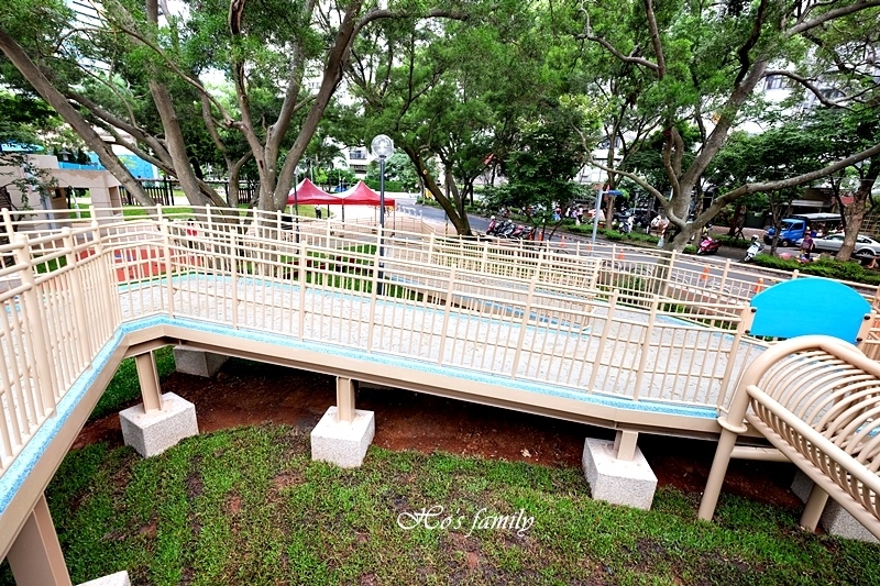 在林口公鄰23公園看到天母東和公園的影子,貼心設計無障礙空間空中棧道,讓身障孩子可以坐輪椅爬上山坡遊玩。
