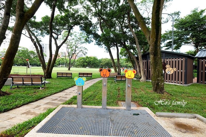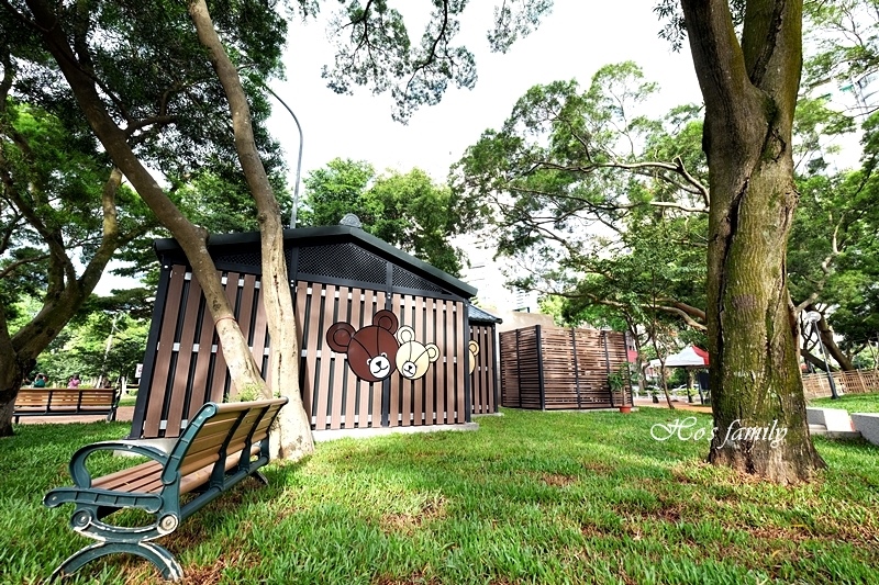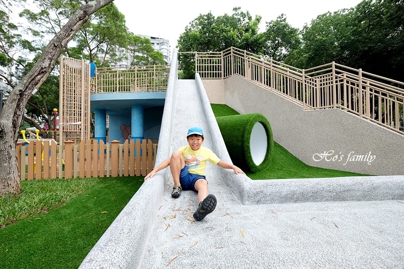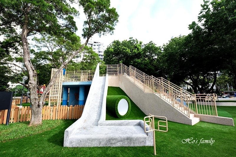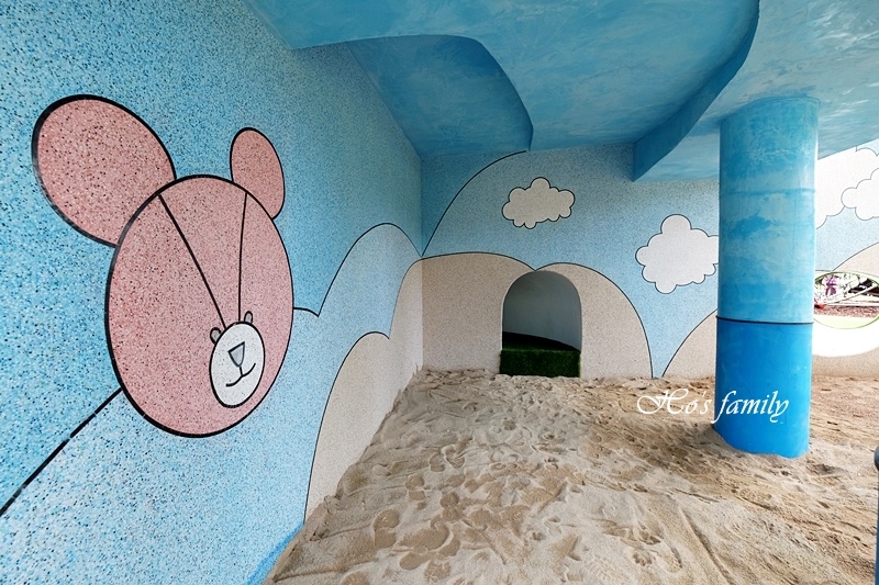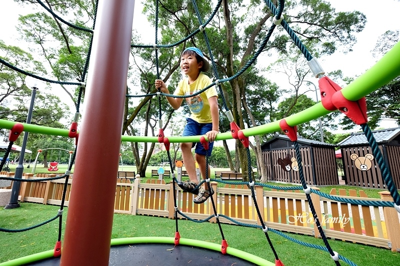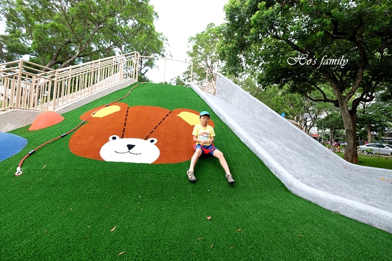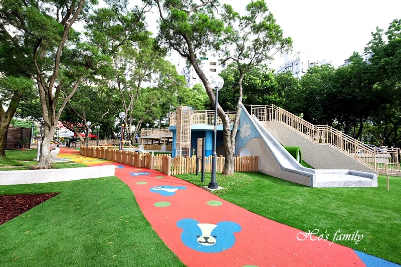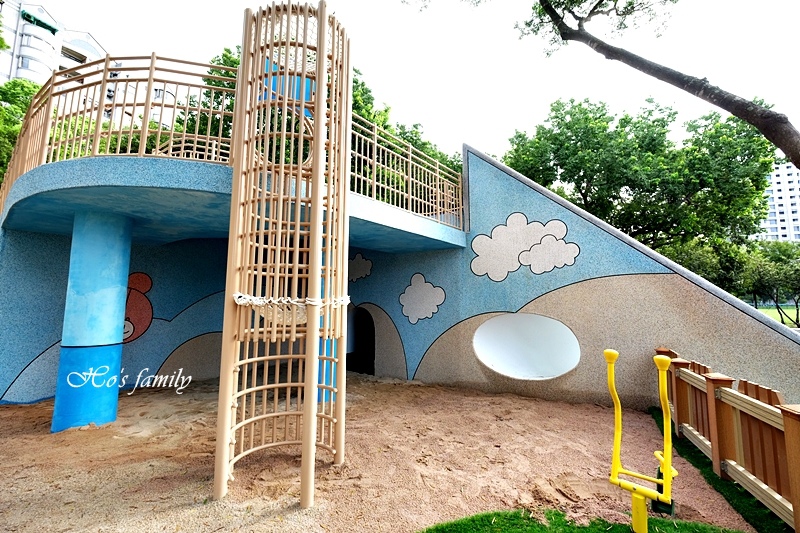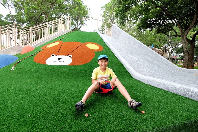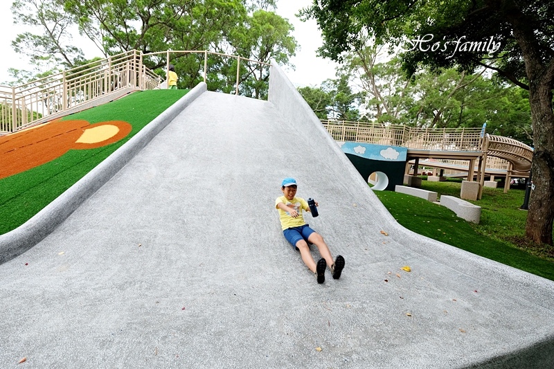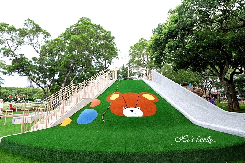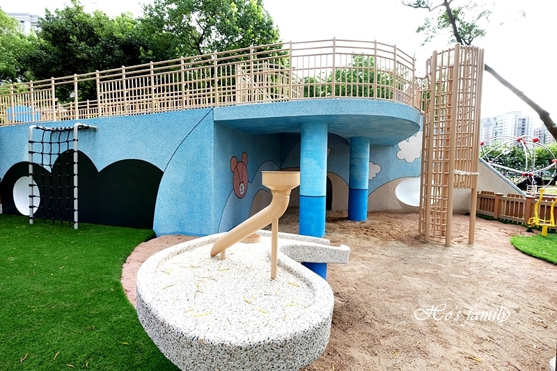 天啊,太可愛了!熊熊主題的山丘磨石溜滑梯好吸睛,綠色人工草皮上還有大台北都會公園幸運草地景溜滑梯及中和員山公園上看到的彩色立體浮球以及拉繩,增加爬坡挑戰性!