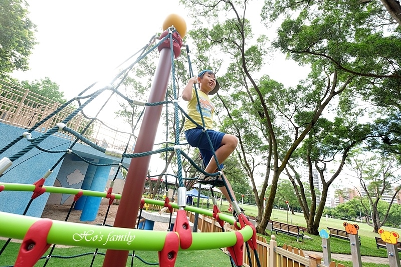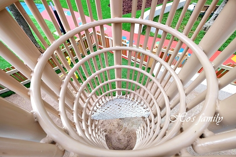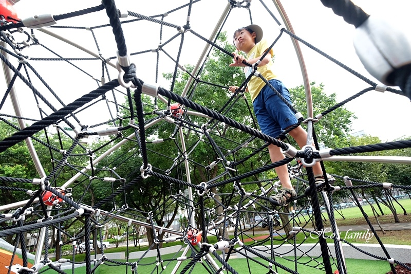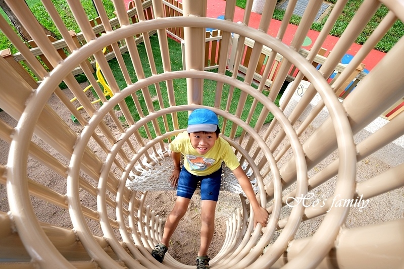 這一頭設有類似天母東和公園的直立式攀爬管,宛如傑克要爬上天空找魔豆的情節,Yo一步步往上爬很有新鮮感!(全台特色攀爬繩網遊戲場)