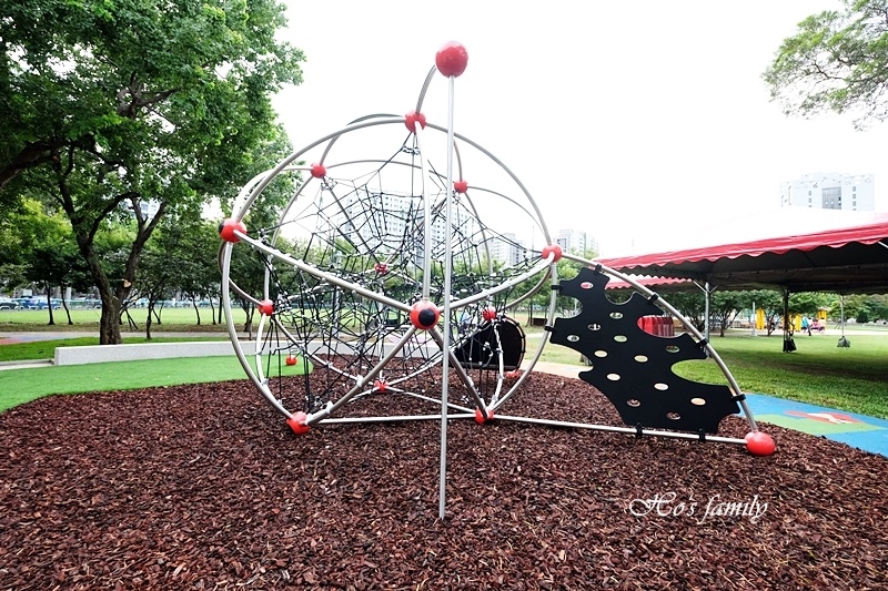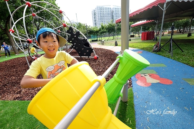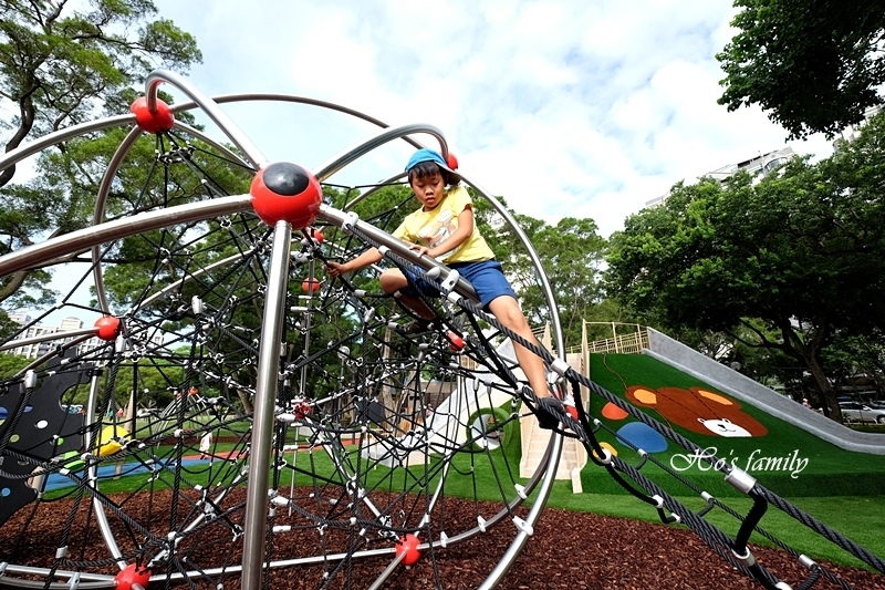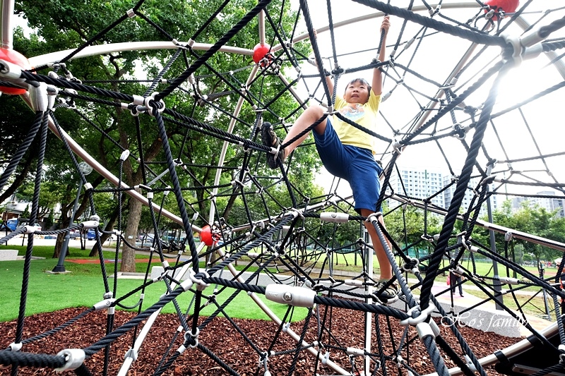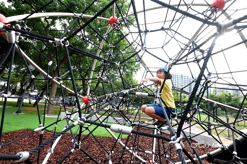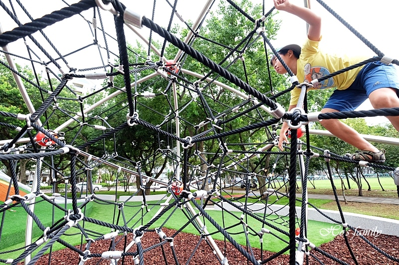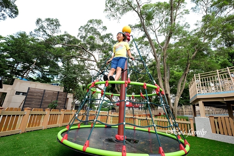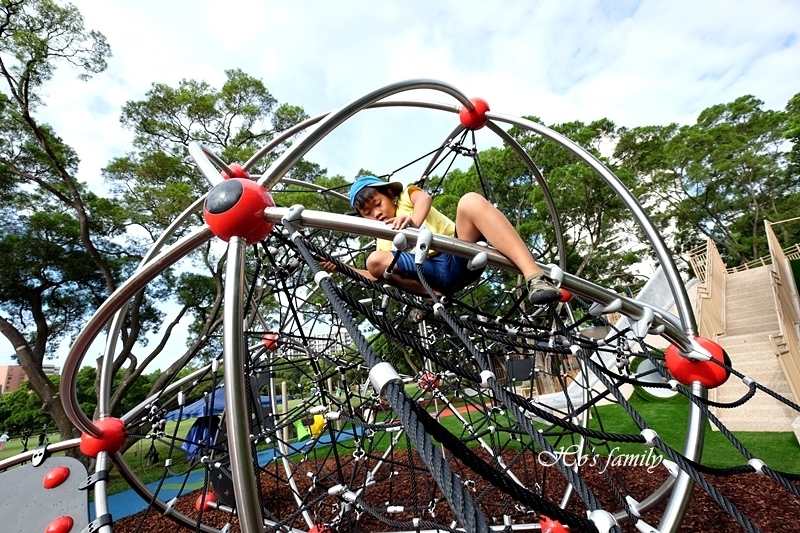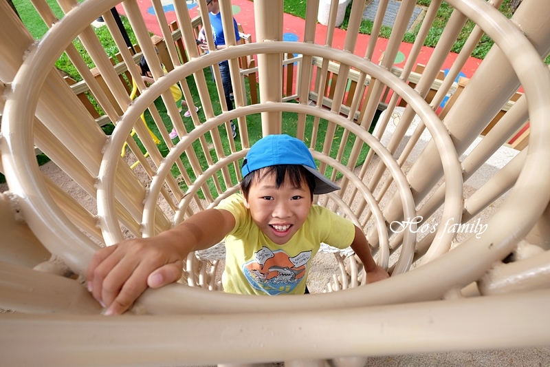 這座攀爬架不但可以爬也可以轉,我們在桃園延平公園、竹圍漁港兒童遊戲場及高雄金獅湖風景區特色遊戲場都有玩過,Yo好愛玩這個,自己推著轉之後爬上去,我們在一旁看了都覺得好玩!
