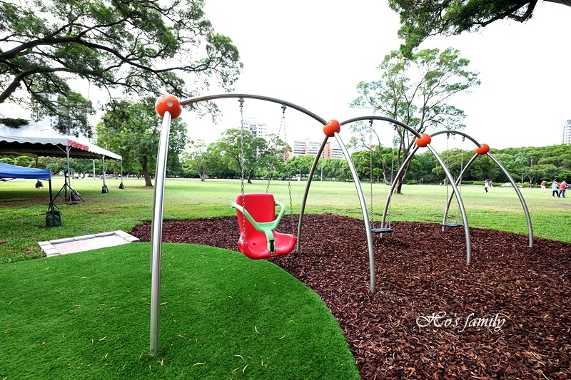 共融式鞦韆,同時滿足一般孩子與身障孩子,最左邊的鞦韆可以讓身障孩子將輪椅推到人工草皮上,方便下輪椅玩鞦韆,很貼心的設計。