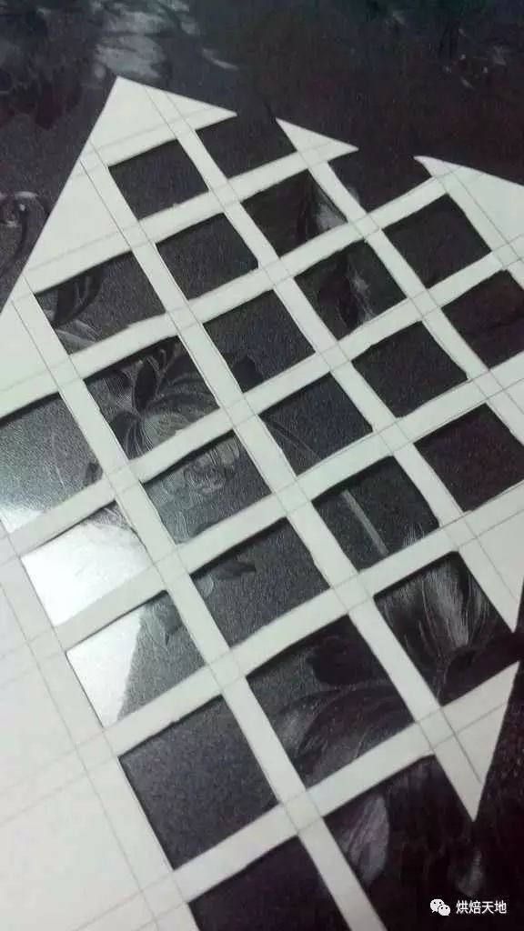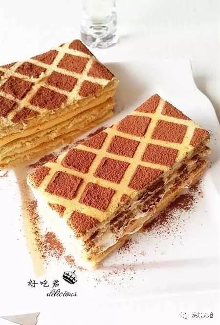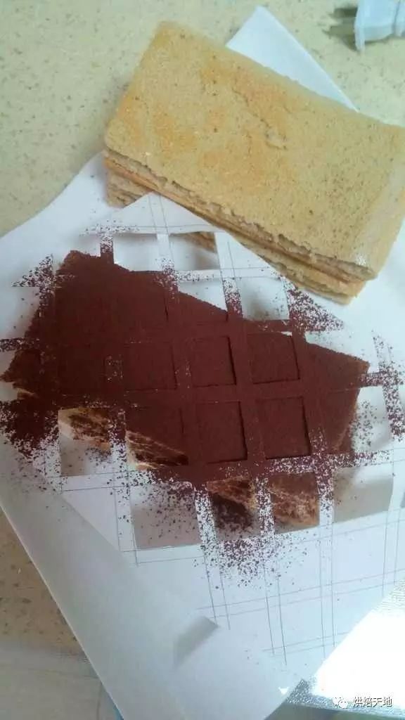 19. 做好兩塊兒蛋糕後,放上菱形模具,篩一層可可粉。