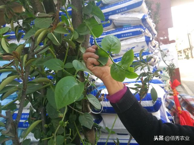 在一家農資店門口,一棵冬青樹上,爬了一棵藤類植物,看起來綠綠嫩嫩的,好像生命力極強的樣子,幾乎爬滿了整棵小樹。