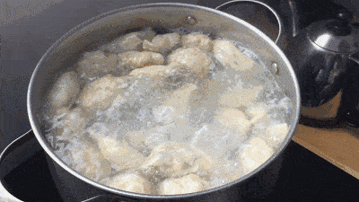 先煮皮後煮餡,蓋鍋蓋煮皮,撇鍋蓋煮餡。水開後,撇開鍋蓋煮餃子,餃子隨滾水不停攪動,餃子皮便熟了,這時蓋上鍋蓋,不用多久餃子餡也熟了,這樣煮又好又快不破皮!