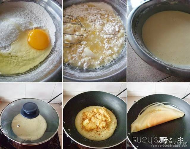 3. 用平底鍋,小火,倒入1杯糊,慢慢散開糊,讓鍋的邊緣也沾上少許糊,關蓋,煮至麵糊出現很多的小洞洞。