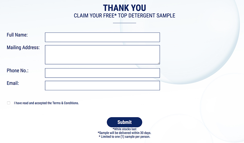 大馬知名品牌 TOP 即日起送出免費洗衣粉,不拿白不拿!快按照下面的簡單 2 步驟來獲得免費洗衣粉吧!而且直接寄送到你家哦!超方便的!