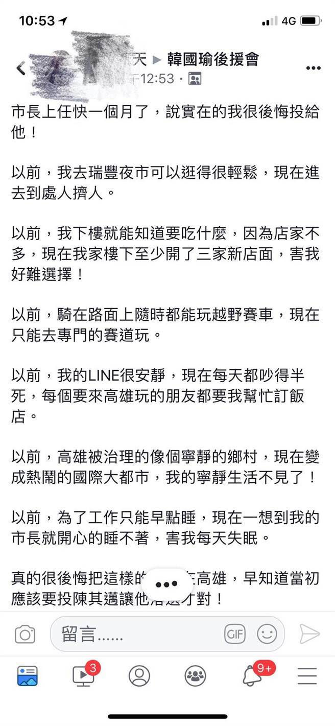 有高雄市民在網路上發表「後悔投給韓國瑜」的心得,說「真的很後悔把這樣的人留在高雄」。(游淑慧提供)