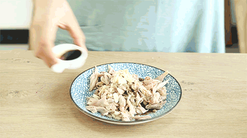 4.將雞腿肉手撕成條,加入蒜末、陳醋、生抽、糖、鹽拌勻(想吃重口一點的,可以將雞肉撕得盡量細一些,更好入味)。