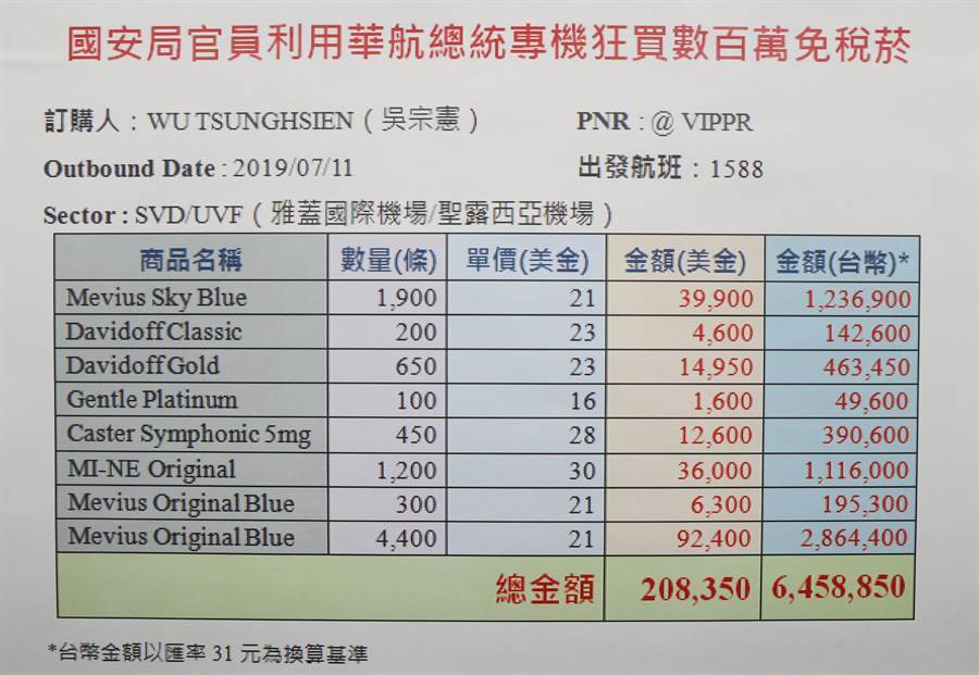 蔡英文總統甫結束出訪友邦返國之際,時代力量立委黃國昌22日踢爆,隨行的國安局官員吳宗憲疑似先透過華航高層在系統後台預訂9200條的免稅菸品(見圖),並預備透過國賓特殊通關禮遇,夾帶入境,金額高達645萬元。(立委黃國昌提供)