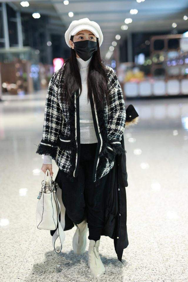 除了普通大氣的黑色大衣,在冬季,我們也可以選擇一款優雅沉穩的小香風大衣外套,伊能靜的這款黑白千鳥格流蘇針織外套,文藝休閒,穿在身上減齡效果不要太好。