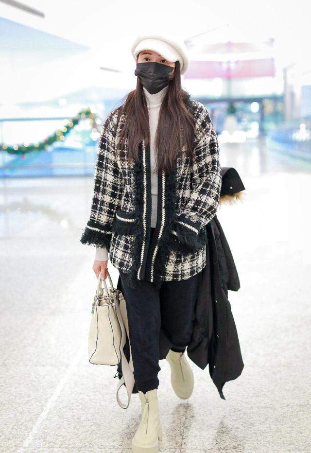 外套的黑白格子設計,低調又有范兒,冷靜選擇一款白色高領毛衣作為內搭穿在身上溫柔又減齡,佩戴上慵懶隨意的白色毛絨貝雷帽,淑女又大方,一頭披肩長發,更是把臉型顯得嬌小柔美,整個氣質都變得高級優雅了。