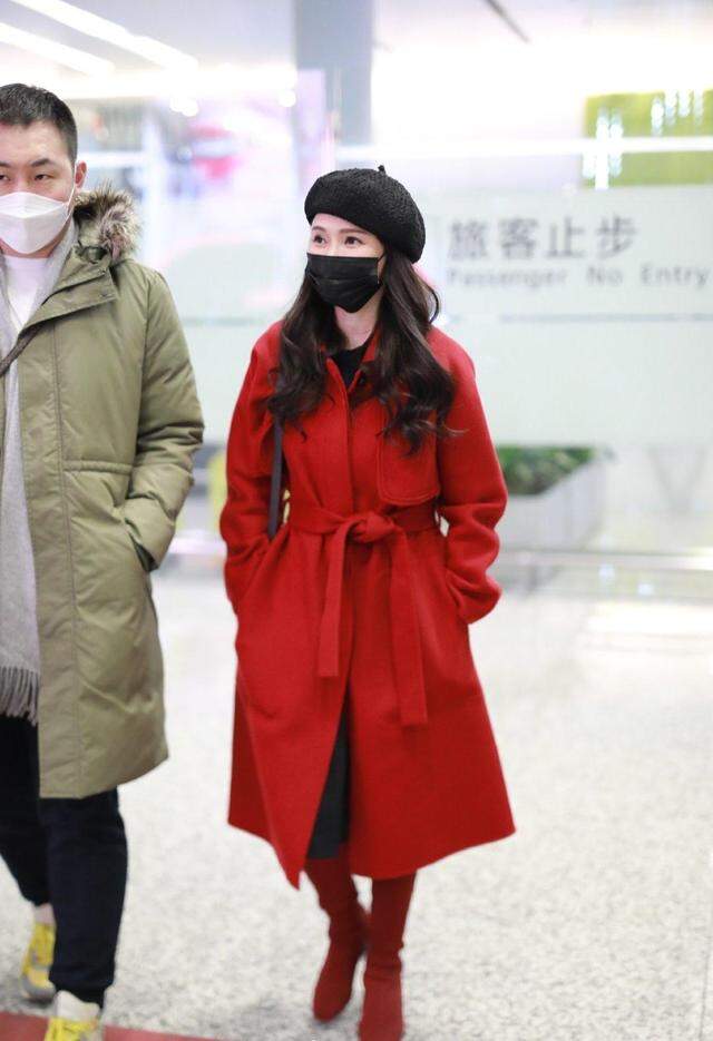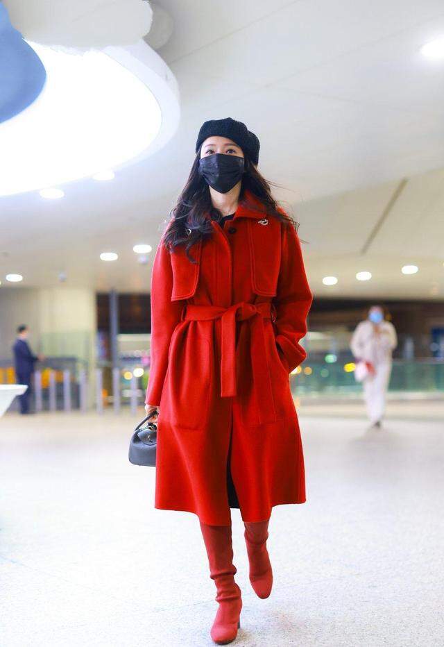 頭上戴著的這款黑色貝雷帽,簡單大氣,和黑色毛呢大衣搭配起來毫無違和感,配上一頭黑色大波浪捲髮,特別彰顯氣質,秀髮的光澤映襯著臉上更顯皮膚白嫩。紅色毛呢大衣的版型,高腰的設計非常修身,打造出完美的身材比例。袖口也相當寬鬆,起到了修飾手臂線條的作用。外套的長度在紅色長靴的靴口位置,避免造型的臃腫感,同時也顯得乾淨利落。