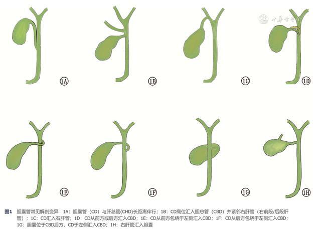膽管的先天性變異率較高,可以達到50%,膽管解剖變異可以影響治療決策。LC僅涉及與膽囊管相關的變異。最常見的情況有以下幾種:膽囊管與肝總管長距離並行,有時膽囊管分叉靠近左右肝管匯合點,此時容易殘留膽囊管結石或損傷右肝管;膽囊管高位匯入膽總管/右肝管/左肝管,容易誤傷膽管;右後段肝管/右前段肝管的參與,包括膽囊管緊靠右肝管走行,右肝管匯入膽囊體/膽囊管及膽囊管匯入右肝管,容易誤傷右肝管,有時需要行右肝管的重建或膽腸吻合;膽囊管於前/後方環繞膽總管,匯入點位於膽總管前方/後方/左側,容易誤傷膽總管或肝總管[15, 16]。漏診膽道變異常出現BDI,可導致患者生活質量嚴重下降甚至死亡[17],見圖1。