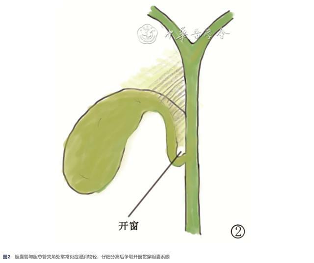 1.處理固化攣縮的膽囊三角:炎症時膽囊繫膜失去了原有的解剖層次,腹膜和其間的結締組織融合形成瘢痕樣固化結構。其間走行的膽囊動脈很難通過肉眼分辨,分離時容易出血。固化攣縮的膽囊繫膜使得膽囊管與肝總管/右肝管緊密相連,如果膽囊處於高張力狀態肝總管與膽囊管可以呈前後位的關係,此時很難精確劈開瘢痕完成CVS要求的「僅有兩個結構進入膽囊」。手術技巧成熟的醫生可以試著劈開增厚的瘢痕,為安全起見應分離靠近膽囊側的繫膜,寧可傷及膽囊不能損傷膽管。在膽囊前三角顯露困難時,可以選擇膽囊後三角作為進入膽囊繫膜和膽囊平面的入路。分離時建議選擇非電力外科器械如剪刀,因為電力外科設備容易誤傷或熱力燒傷膽管,造成膽瘺等併發症。膽囊管與膽總管夾角處常常炎症浸潤較輕,此處向後旋轉的角度也較小,仔細分離後爭取開窗貫穿膽囊繫膜,然後離斷膽囊管(圖2)。