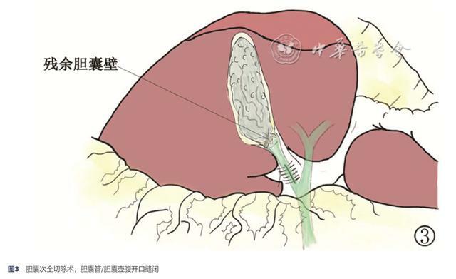 膽囊部分/次全切除術+膽囊結石取出術+膽囊管或膽囊壺腹縫閉術+膽囊殘餘黏膜滅活術+腹腔引流術(簡稱膽囊次全切除/黏膜滅活術):此術式策略的前提是:取淨結石,如有條件應行術中膽道造影證實;殘留的膽囊黏膜要充分滅活;腹腔留置引流管[25]。由膽囊底開始沿膽囊床邊緣切開膽囊壁,清除膽囊結石和膽汁,逐漸向內側切除儘可能多的膽囊,保留內側的膽囊壁(即與肝總管和右肝管粘連固化的膽囊部分)。如果能在膽囊管匯入膽總管的夾角處開窗(此處常常是炎症較輕的部位)則行膽囊管夾閉和離斷,否則選擇縫閉的方式處理膽囊管/膽囊壺腹的斷端,建議使用倒刺線縫合。殘餘的膽囊黏膜用電刀或雙極電凝進行充分地滅活,然後在肝下留置引流管,即使術後出現膽漏,大多會自行癒合。此手術策略既達到了膽囊疾病的治療目的,又避免了難以控制的出血和BDI的發生(圖3)。