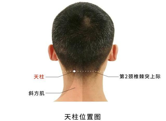 天柱穴,在頸部,大筋(斜方肌)外緣之後髮際凹陷中。