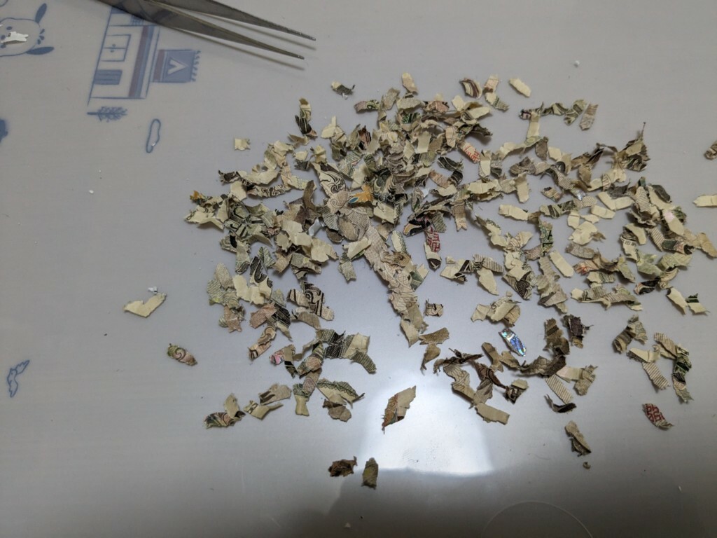 帳號暱稱「Tomo」的網友在推特紀錄修復萬元鈔票之路。當初1萬元是跟文件一起被攪碎,所以Tomo必須先把鈔票從一堆紙屑裡面挑出來。