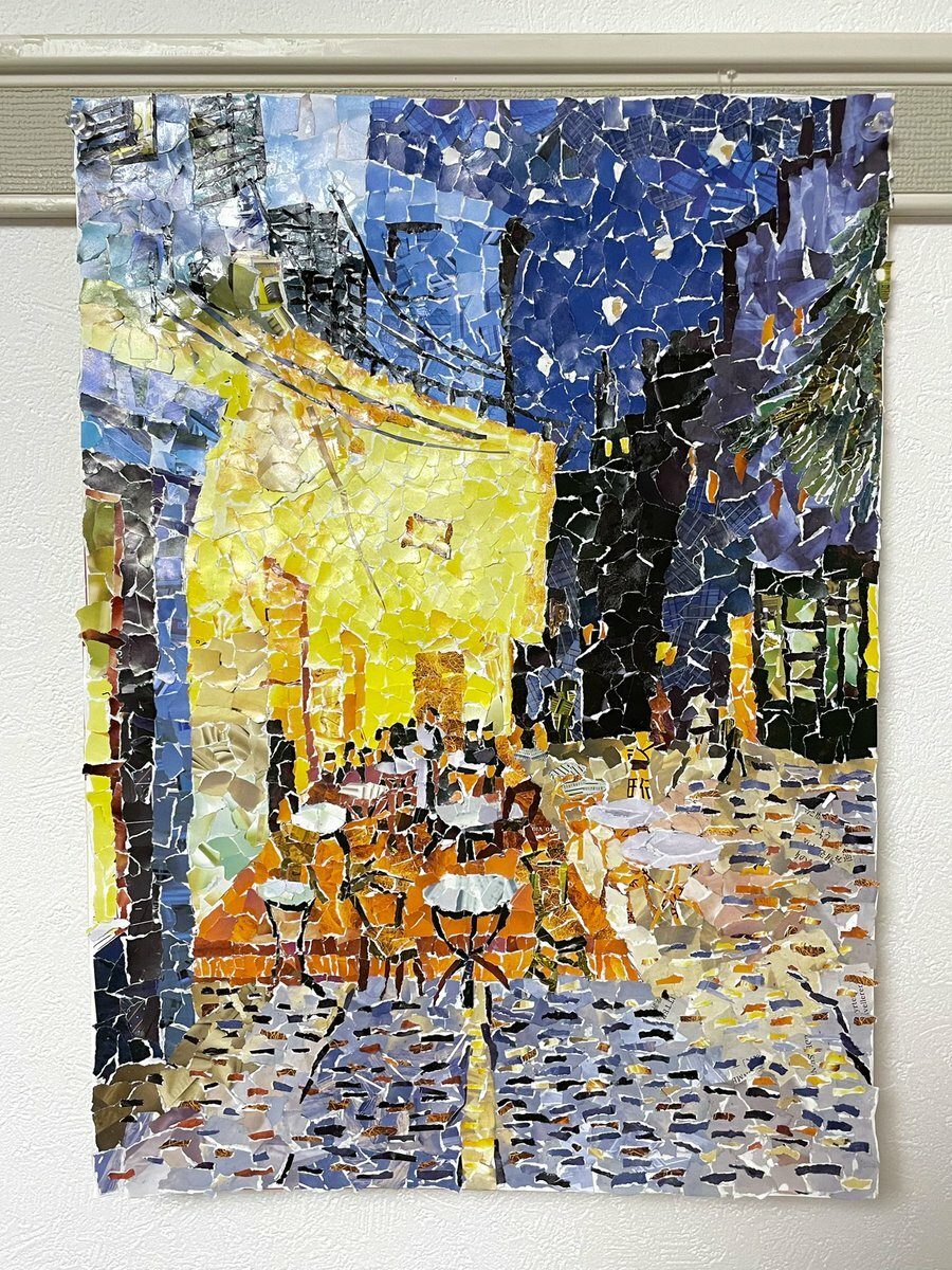 和Tomo一樣很有拼貼天分又有耐心的日本人不只一例!推特帳號名稱為「@tai_oi_shii」的日本網友,在簡介上透露自己對創作及攝影的興趣,常在網路上分享不同領域的藝術作品。他曾貼出一張拼貼畫,感嘆面試通通失敗了,他將幾家公司拿回來的簡介小手冊撕碎,複刻一幅梵谷名畫。