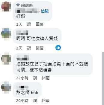 雖然小甜甜隨文附上影片,並喊話「那些也覺得自己沒有抽獎運跟我一樣會亂丟摸彩券的人,未來可以先收好因為你永遠不知道….下一個中獎的可能就是你,幸運什麼時候來不知道,但先預備好別讓它跑掉」,但網友留言「呵呵,可性度讓人質疑」、「ㄧ對成群取暖的邊緣人」、「抽獎放在袋子裡面抽最下面的不就很可憐….根本沒機會」。