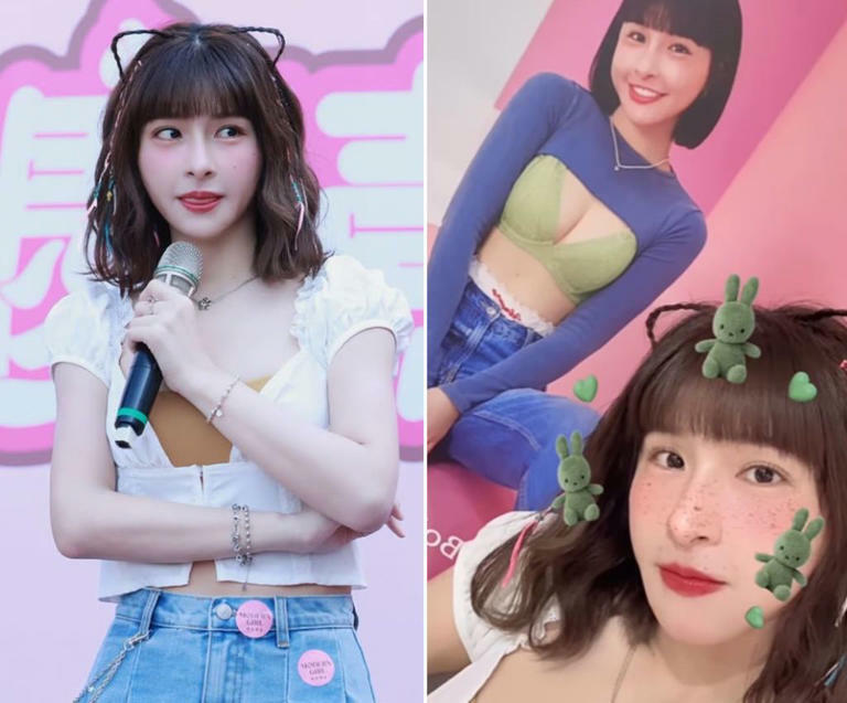 從峮峮分享的照片中,可見她將頭髮燙捲,更用辮子編成貓耳朵造型,十分俏皮。她身穿黃色小可愛外搭白色短袖上衣,短版設計露出小蠻腰,再配上牛仔短裙,整體少女感十足。而另一張照片中,峮峮站在標有「代言人休息室」的門牌前,仰著頭吐舌頭,但視線往下,卻發現這個角度把她火辣身材全拍了下來。