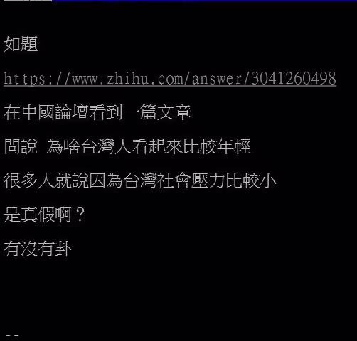 台灣一位鄉民在PTT八卦板上轉發中國論壇《知乎》上的一篇問答,有中國網友發問:「為什麼台灣人普遍看起來比較年輕?」這位鄉民瀏覽中國網友的回答後,也好奇台灣網友的看法:「很多人就說因為台灣社會壓力比較小,是真假啊?」