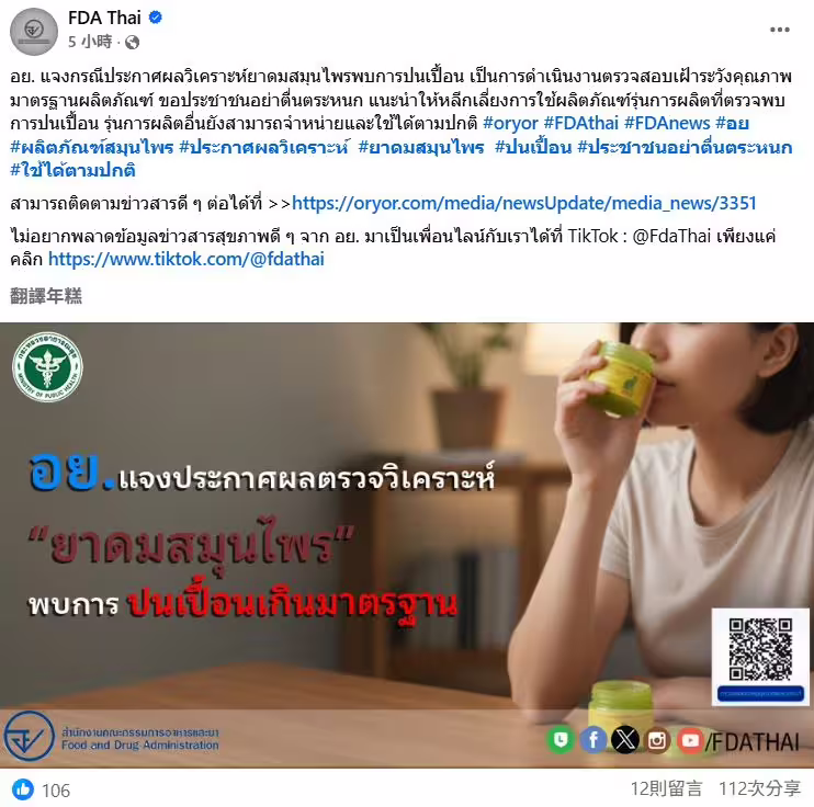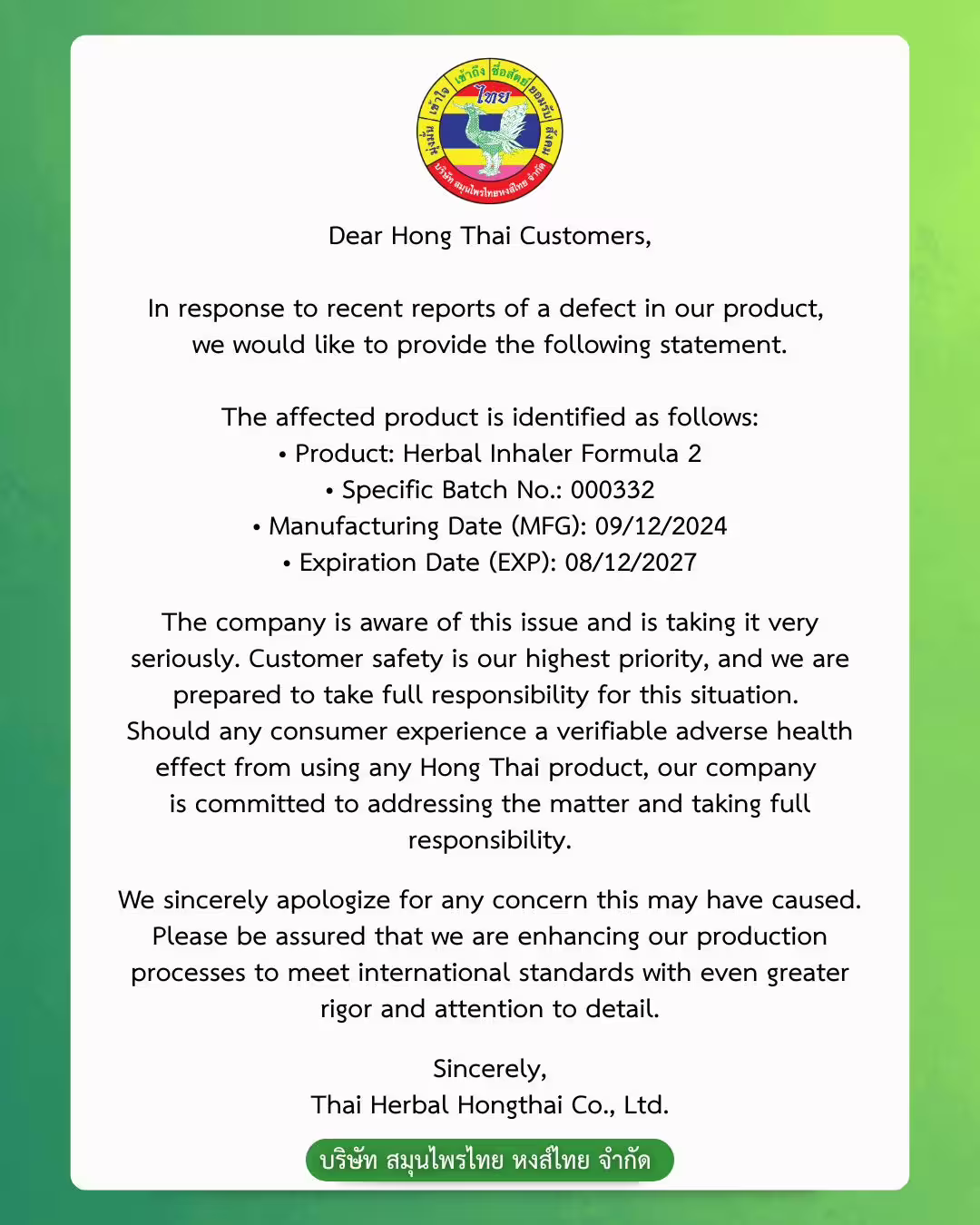 根據《曼谷郵報》報導,泰國食品藥物管理局公告,製造商提供的「洪泰草藥鼻通配方2」樣品經衛生檢測後,發現微生物超標。根據《草藥產品法》,該批次產品被判定不合格。泰國食品藥物管理局今天 (29) 說明這是產品例行性檢測,呼籲民眾不用恐慌,建議停用受汙染的批次,其他批次仍可正常銷售與使用。