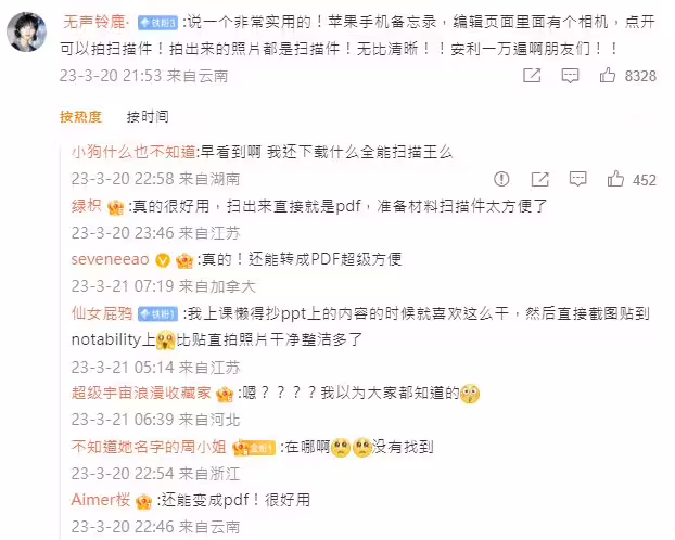 問題拋出後,果迷們紛紛提供自己知道的隱藏功能,其中一名網友就指出,「蘋果手機備忘錄,編輯頁面裡有個相機,點開可以掃描!拍出來的照片都會轉為PDF,無比清晰,推薦一萬遍啊!朋友們」。