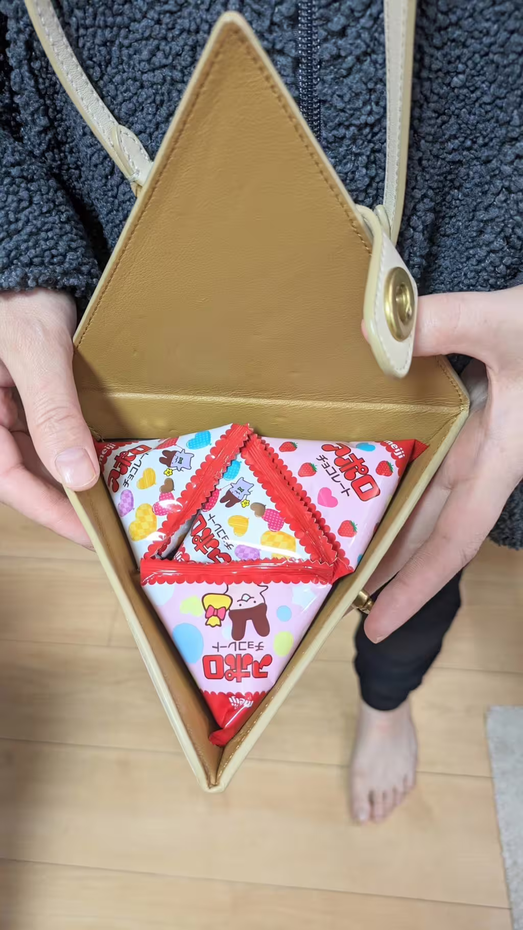 這款「類.千年積木包」容量非常小,還有角度限制,所以原PO還特別找了形狀相符的小零食來裝,發現可以容納5包。