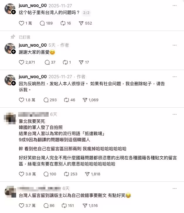 然而,金姓軍人疑似透過翻譯功能檢視留言後產生誤會,以為引發台灣網友不滿,隨即緊張地問「請問我的 PO文有冒犯到台灣人嗎?」、「如果有社會問題我會刪掉,請告訴我」。