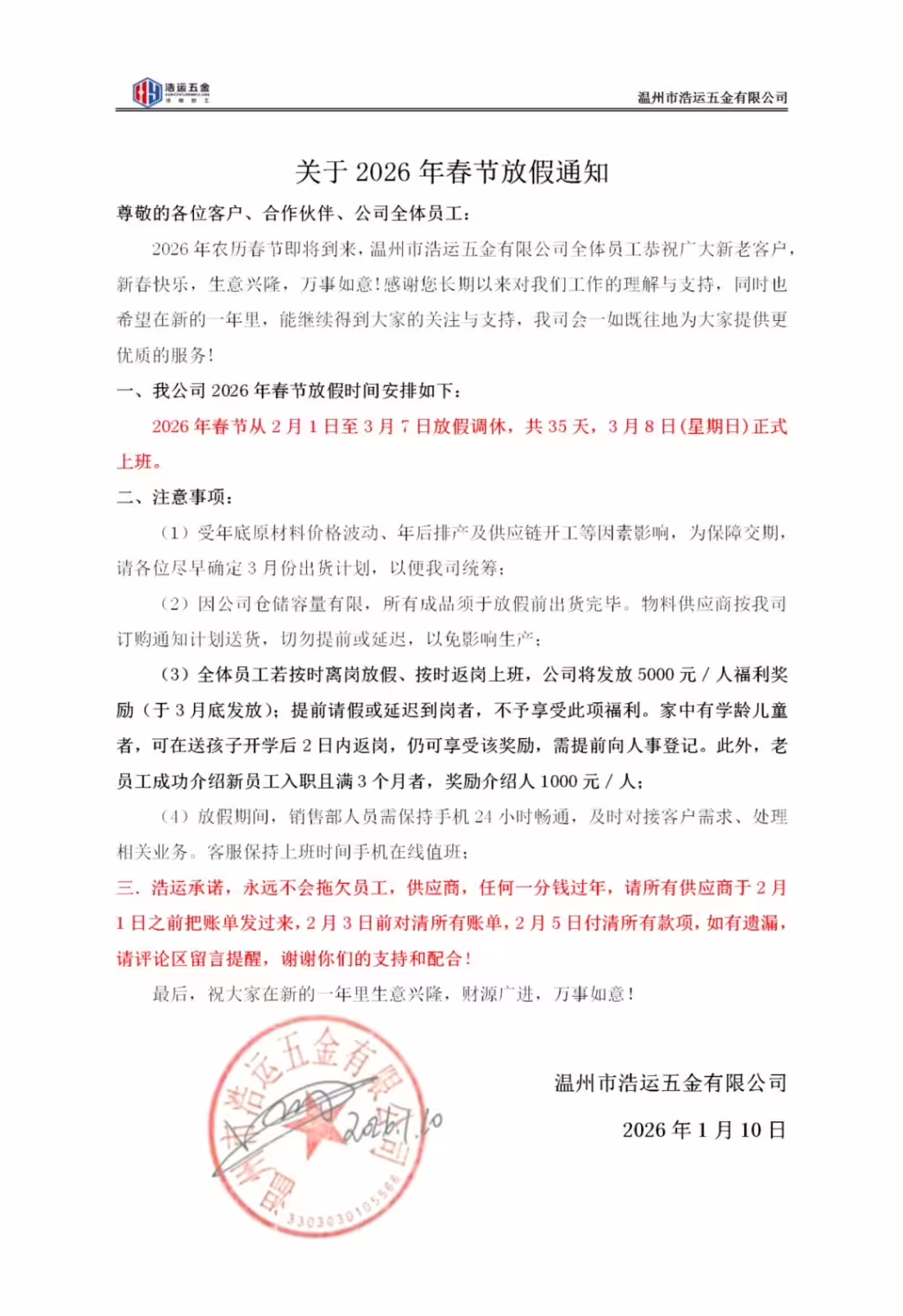 根據《都市快報》、《九派新聞》報導,位於浙江省溫州市的「浩運五金」近日宣布春節放假通知,該公司預計從2月1日開始放假,3月8日才正式上班,春節一連休了35天。公司還表示,如果員工準時放假、開工,3月底就能領到福利金5千元 (約新台幣2萬3千元) ,家裡有小孩的員工還能等開學後延遲2天再回來上班。
