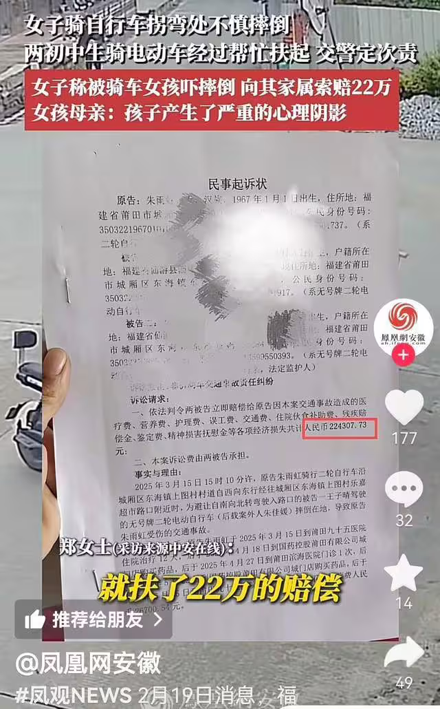 根據《中安在線》、《中國藍新聞》報導,去年 (2025年) 3月15日下午,朱姓婦人表示自己騎自行車到路口時,為了閃躲2名國中女生騎的電動腳踏車才會摔倒。不過女同學的媽媽鄭小姐反駁,路口監視器顯示朱婦為了躲前一輛白色轎車就已經重心不穩,後來女兒和朋友騎車路過,看到朱婦倒地時有猶豫是否上前幫忙。朋友提議:「那就扶唄,又沒事。」兩個孩子才幫忙牽起腳踏車並扶起老人家。