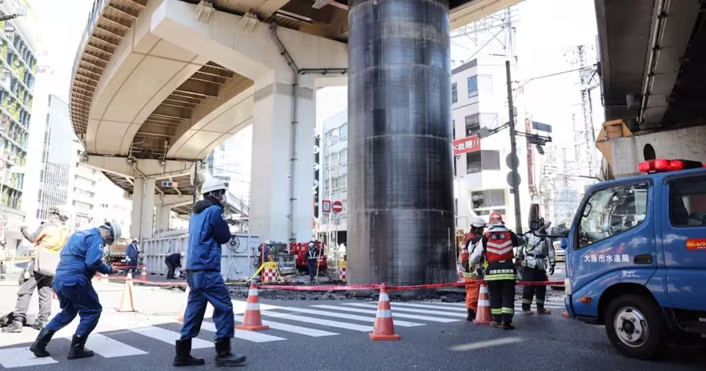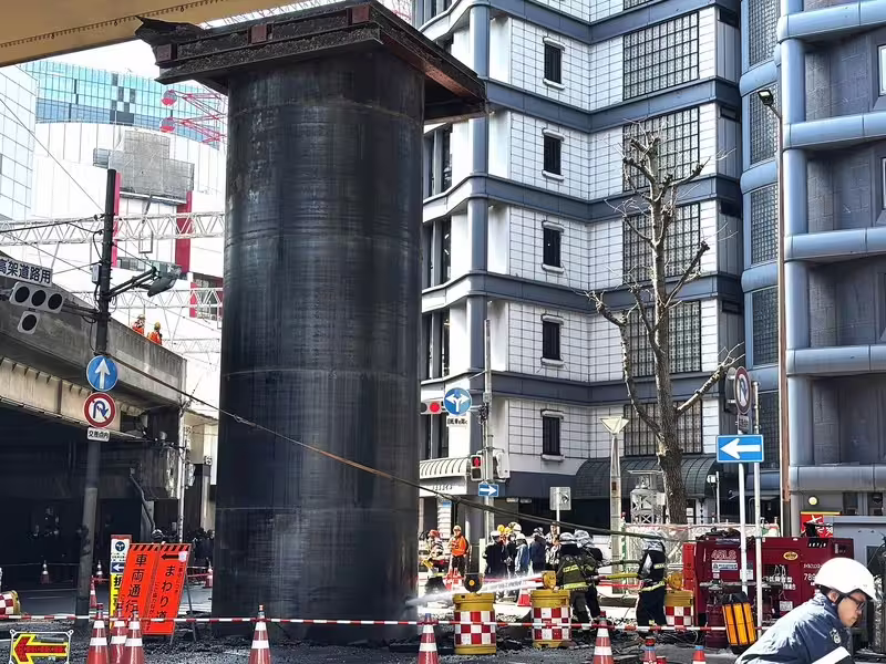 日本阪急大阪梅田站附近的熱鬧商業區,昨天 (11) 一早7點,有民眾報警表示「工地有混凝土掉落」,結果警方到現場發現事情超大條,趕緊召集人力將事發地點圍起來。因為現場瀝青碎片四散的原因,竟是有個高達10公尺高的龐然巨物衝破地面。
